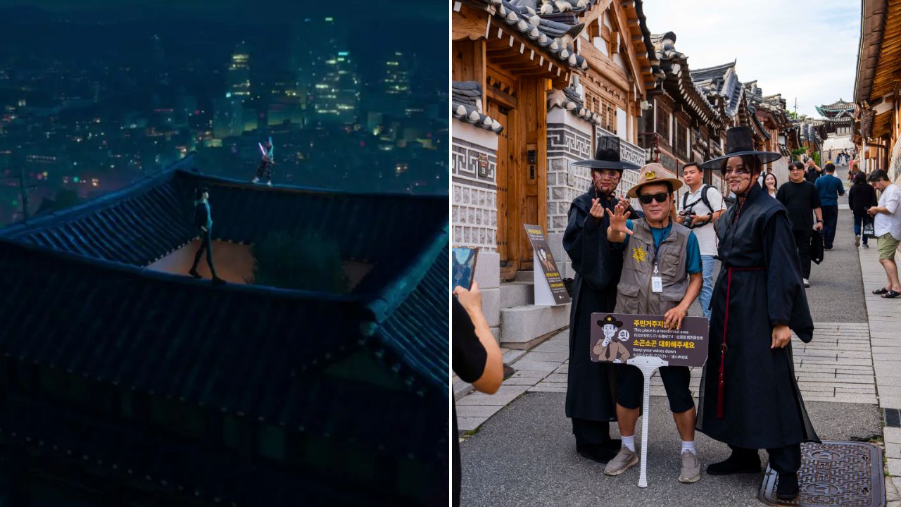Após se conhecerem no bairro de Myeongdong, Jinu e Rumi param para conversar pela primeira vez nos telhados da Vila Hanok de Bukchon. Vale lembrar que “hanok” são as casas tradicionais coreanas, conhecidas por sua arquitetura com materiais naturais como madeira e pedra e telhados curvos.