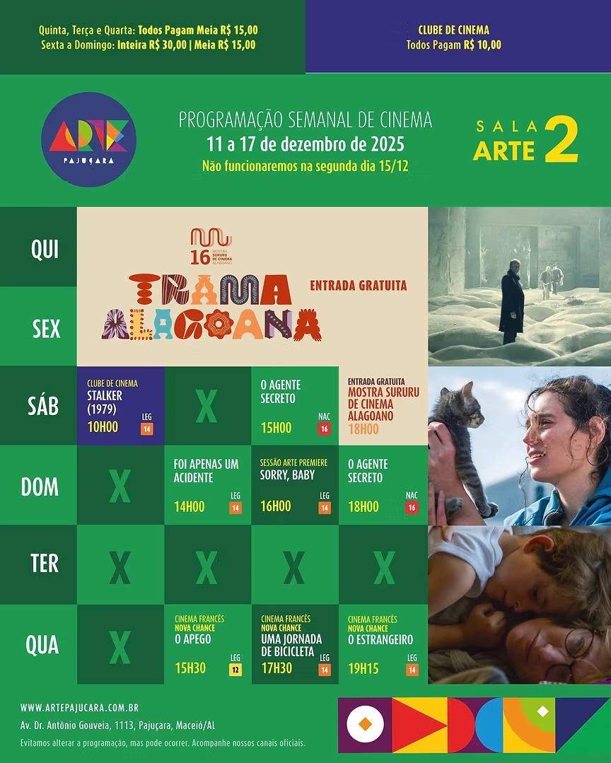 Para conferir a programação completa de todos os filmes em cartaz no Arapiraca Partage Shopping, Centerplex (Shopping Pátio Maceió), Cinesystem (Parque Shopping) e Kinoplex (Maceió Shopping): basta clicar aqui. Já para o Shopping da Vila, em Delmiro Gouveia, pode ser conferida aqui.