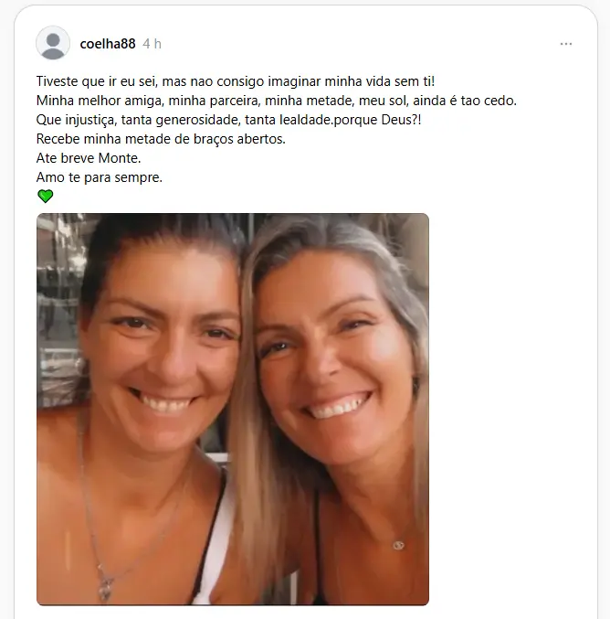 A irmã gémea de Paula Coelho, Sandra Coelho, confirmou a morte com uma publicação na rede social Threads. “Tiveste que ir eu sei, mas não consigo imaginar a minha vida sem ti! Minha melhor amiga, minha parceira, minha metade, meu sol, ainda é tão cedo. Que injustiça, tanta generosidade, tanta lealdade, porquê Deus?! Recebe a minha metade de braços abertos. Até breve Monte. Amo-te para sempre”, escreveu.
