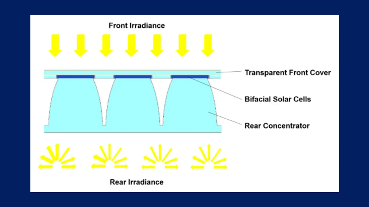 A proposta da equipa distingue-se destas soluções convencionais. O sistema, batizado de RearCPVbif (Rear Concentrator Photovoltaic bifacial), é um módulo semitransparente inovador.