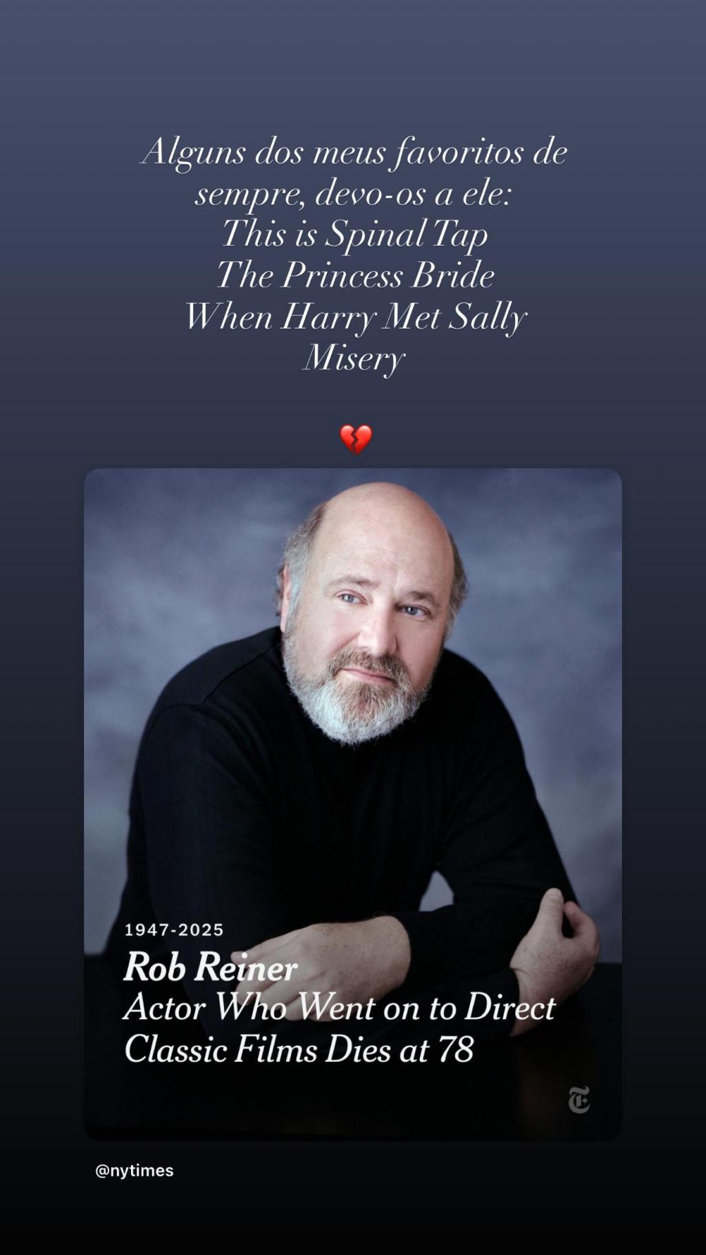“Alguns dos meus favoritos de sempre devo-os a ele”, começou por referir o radialista, enumerando, de seguida, esses filmes realizados por Rob Reiner: “This is Spinal Tap”; “The Princess Bride”; “When Harry Met Sally” e “Misery”. Na legenda de uma notícia sobre a morte de Rob Reiner, Nuno Markl acrescentou um emoji em forma de coração partido.