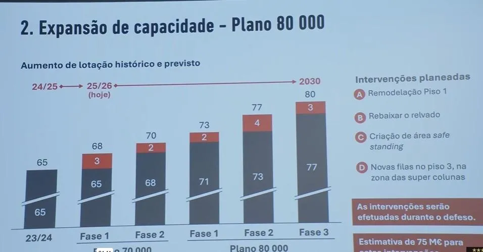 «É uma informação que nunca veiculámos desta forma», começou por dizer. «Uma parte passa pela remodelação do piso 1, que implica aumentar o conjunto de filas desse piso. Permite fazer novas filas e tem várias implicações de intervenção para trás, mas que é possível fazer. Há um segundo passo que passa por rebaixar o relvado. É possível fazer porque é terra é dá para rebaixar e fazer um conjunto de filas para o estádio ficar mais à inglesa, com as pessoas ainda mais perto do campo. Isso dá para aumentar mais uns milhares de lugares», revelou.