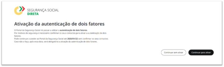 Se optar por avançar sem ativar o 2FA, poderá fazê-lo da próxima vez que voltar a iniciar sessão com o seu NISS e palavra-chave no Portal da Segurança Social.