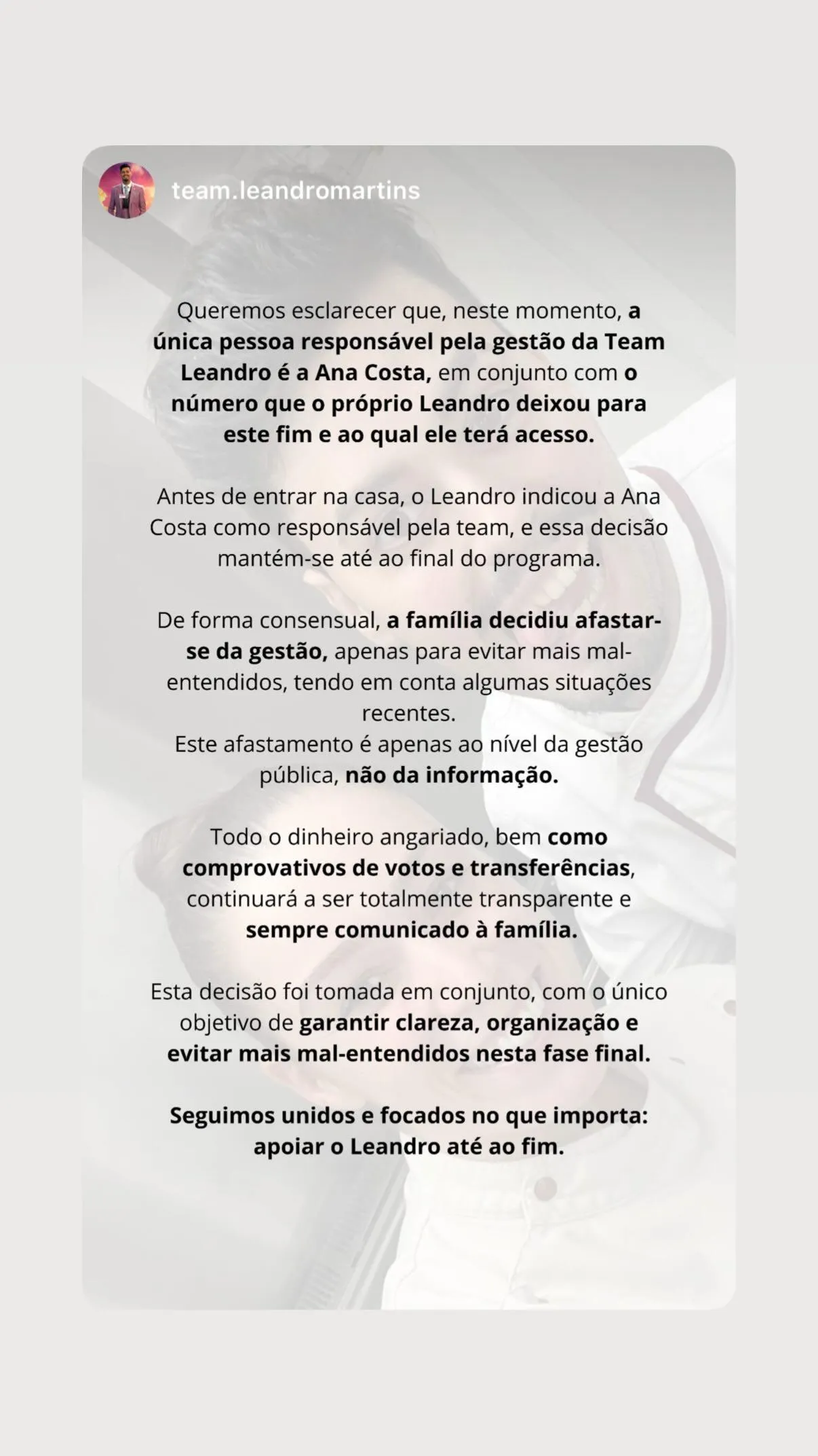 Já nesta sexta-feira, dia 19, os representantes de Leandro Martins voltaram àquela rede social para deixar uma nova mensagem, que indica uma decisão tomada pelos familiares do morador da mansão da Malveira. “Queremos esclarecer que, neste momento, a única pessoa responsável pela gestão da Team Leandro é a Ana Costa, em conjunto com o número que o próprio Leandro deixou para este fim e ao qual terá acesso. Antes de entrar na casa, o Leandro indicou a Ana Costa como responsável pela team e essa decisão mantém-se até ao final do programa. De forma consensual, a família decidiu afastar-se da gestão, apenas para evitar mais mal-entendidos, tendo em conta algumas situações recentes. Este afastamento é apenas ao nível da gestão pública, não da informação”, clarificaram.