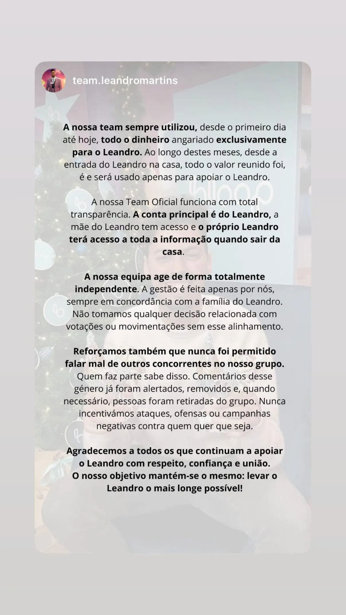 “A nossa team oficial funciona com total transparência. A conta principal é do Leandro, a mãe do Leandro tem acesso e o próprio Leandro terá acesso a toda a informação quando sair da casa. A nossa equipa age de forma totalmente independente. A gestão é feita apenas por nós, sempre em concordância com a família do Leandro. Não tomamos qualquer decisão relacionada com votações ou movimentações sem esse alinhamento”, deixaram claro, prosseguindo: “Reforçamos também que nunca foi permitido falar mal de outros concorrentes no nosso grupo. Quem faz parte, sabe disso. Comentários desse género já foram alertados, removidos e, quando necessário, pessoas foram retiradas do grupo. Nunca incentivámos ataques, ofensas ou campanhas negativas contra quem quer que seja.”