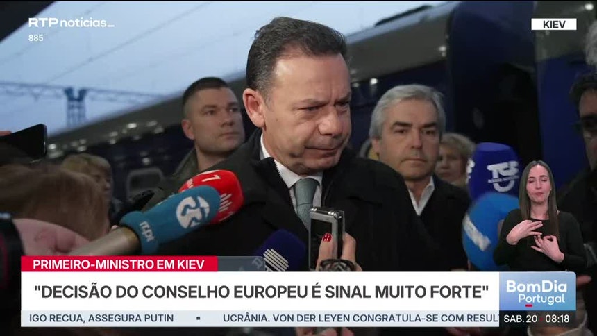 Luís Montenegro falou aos jornalistas à chegada à estação ferroviária de Kiev, dois dias depois de um Conselho Europeu que aprovou um apoio de 90 mil milhões de euros para a Ucrânia nos próximos dias.