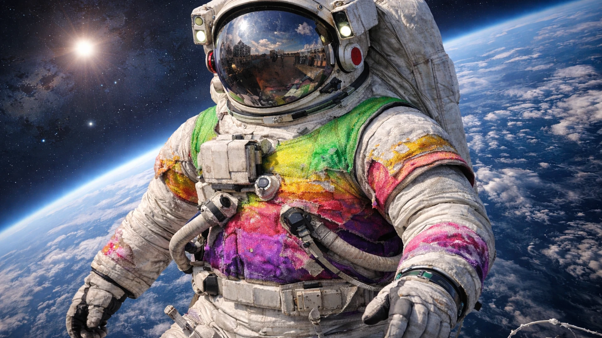 Ilustração de um astronauta com um fato espacial desenvolvido com tecido composto por camadas sobrepostas impregnadas com pigmentos bacterianos de diferentes cores.