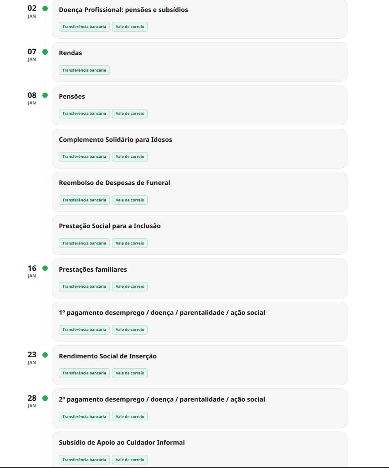 O sítio da Segurança Social divulgou o calendário com as datas de pagamento das prestações sociais referentes ao primeiro mês do ano de 2026 que aqui reproduzimos.
