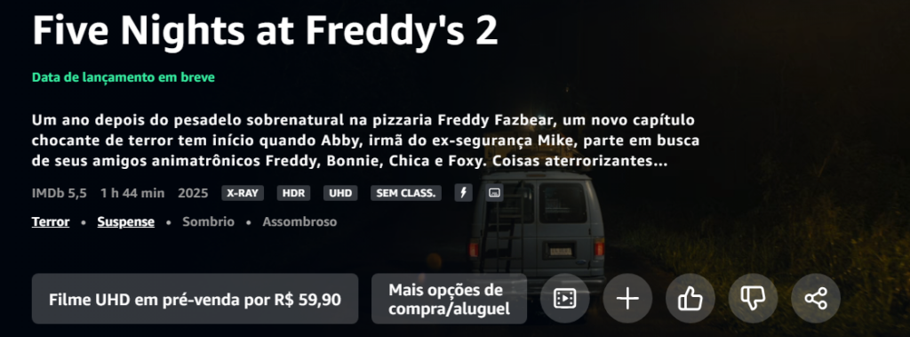 A Universal Pictures está muito satisfeita com a bilheteria de Five Nights At Freddy’s 2 (2025). A satisfação é tanta que o estúdio está lançando o longa em streaming on demand nos Estados Unidos apenas 18 dias depois da estreia nos cinemas.