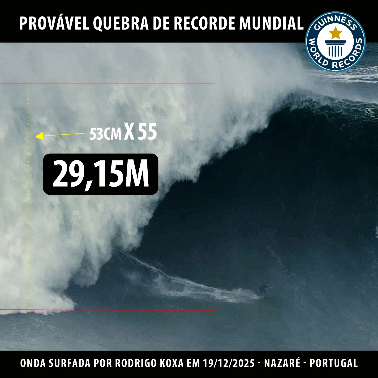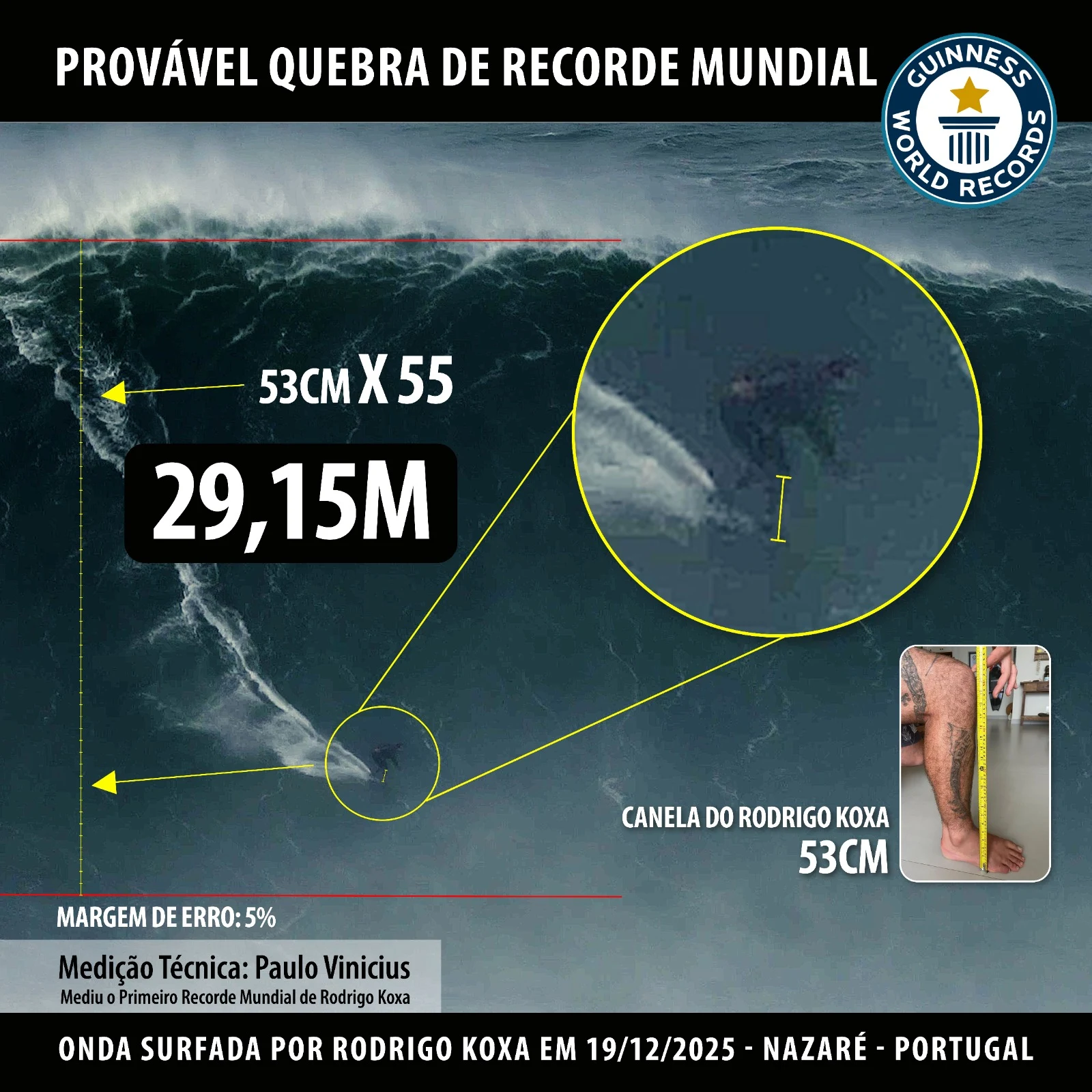 A medição teve como referência a canela de Rodrigo Koxa (53 cm), cruzada com a escala visual da onda, resultando num cálculo final de 29,15 metros, com uma margem de erro estimada em 5%, apresentada de forma transparente no estudo gráfico agora divulgado.