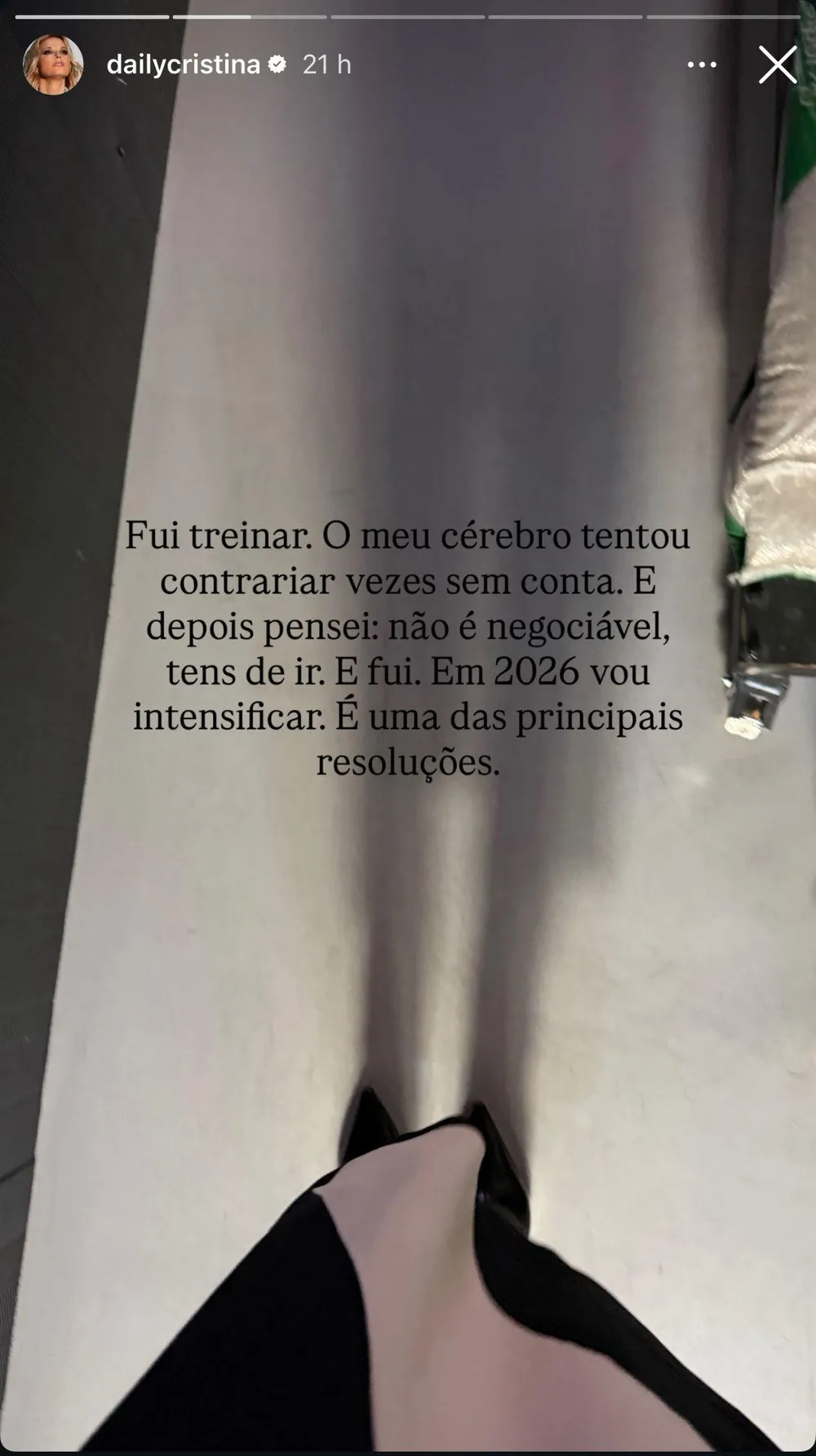 «Fui treinar. O meu cérebro tentou contrariar vezes sem conta. E depois pensei: não é negociável, tens de ir. E fui. Em 2026 vou intensificar. É uma das principais resoluções», escreveu Cristina, numa publicação que rapidamente gerou reação entre os fãs.