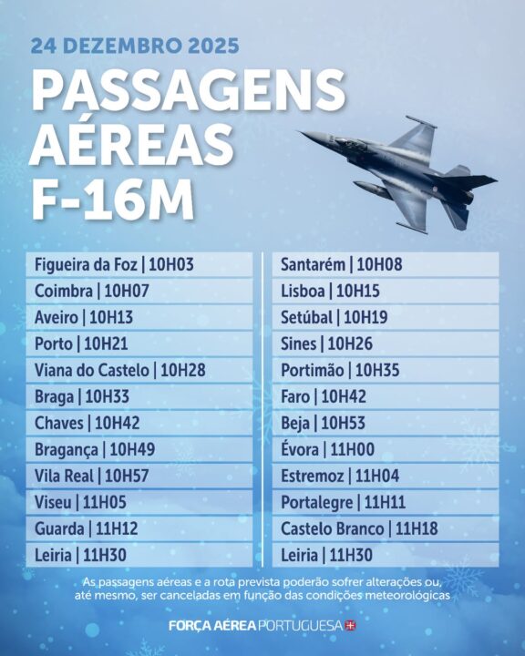 Não é o “Ho-ho-ho” mas é bem melhor! 🤩 A Força Aérea, através de uma parelha de F-16M, vai sobrevoar algumas regiões de Portugal Continental durante a manhã de hoje como forma de desejar a todos um Feliz Natal.