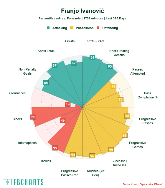 O jogador prepara-se assim para deixar o St. Gilloise e ser colega de posição de Vangelis Pavlidis, que foi o titular indisuctível para Bruno Lage em 2024/25. Eis um gráfico que evidencia as capacidades do croata:
