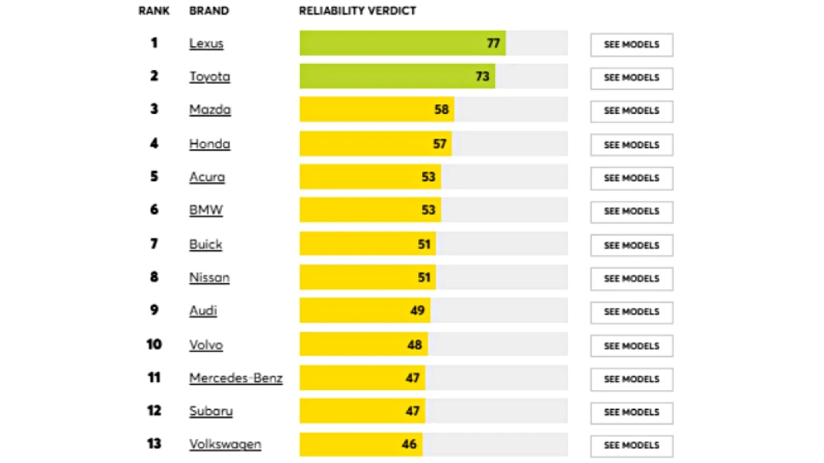 Vejamos a lista completa deste ano. No topo surgem os suspeitos do costume: Lexus, Toyota e Mazda, com classificações médias de fiabilidade de 77, 73 e 58 pontos, respetivamente, numa escala até 100. Seguem-se de perto a Honda, com 57, e a Acura, com 53, a fechar o top cinco.
