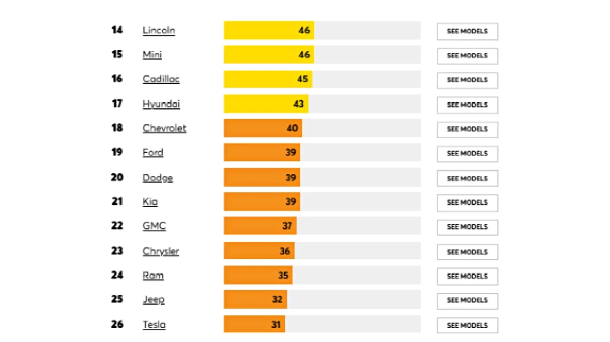 Entre as últimas posições encontram-se marcas muito populares no mercado americano, como a Jeep, Chrysler, GMC e Ram. E… sim, no fundo da tabela está a Tesla, com uma pontuação de fiabilidade particularmente baixa: 31.