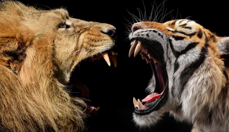 Leões e tigres estão bastante equiparados, tanto em tamanho como em armamento natural, por isso não é nada óbvio qual teria vantagem se, de repente, começassem a voar pelo ar tufos de pelo.