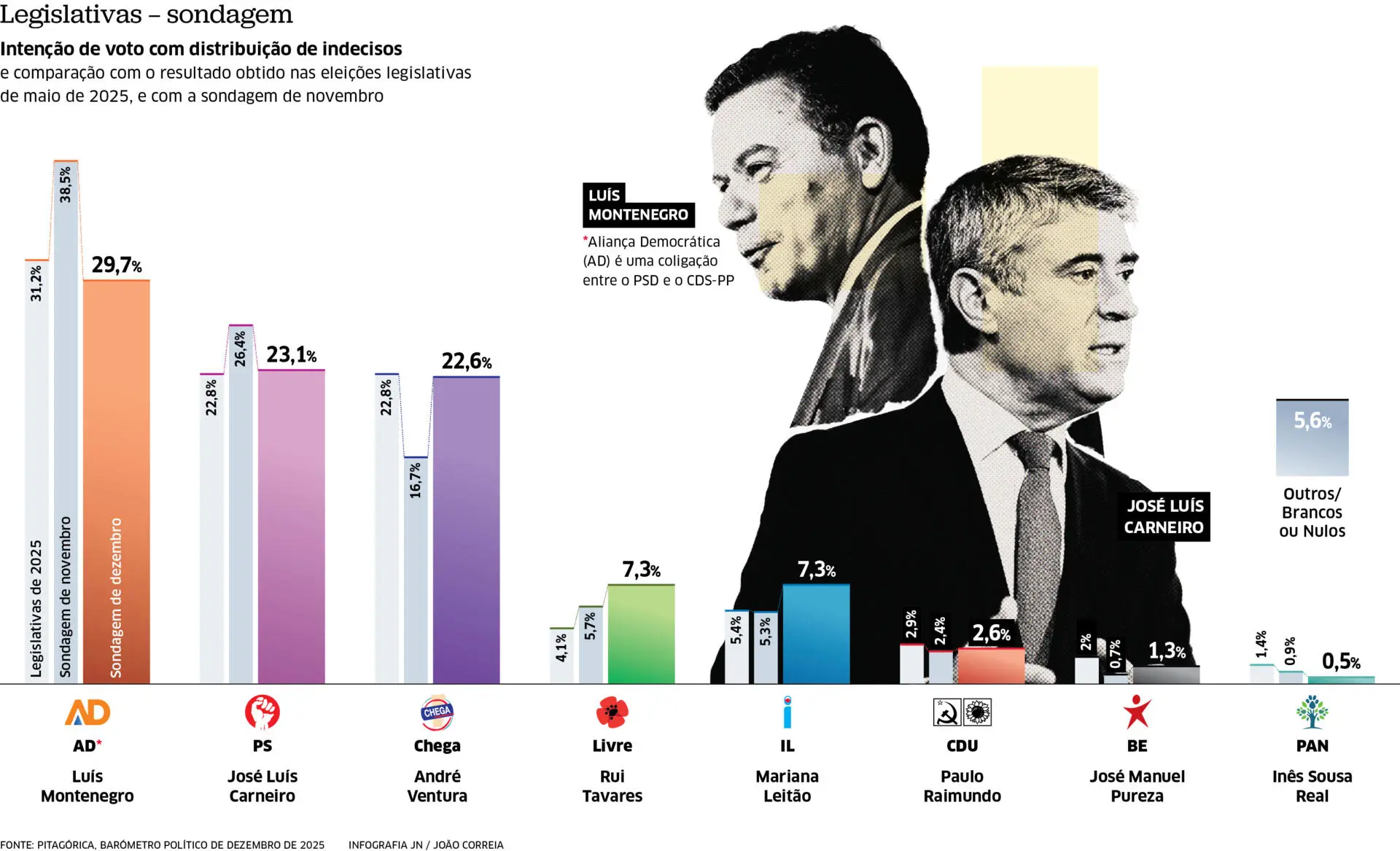 Em apenas um mês, a AD caiu quase nove pontos para os 29,7%, reduzindo para metade a vantagem que tinha sobre o segundo lugar. Em novembro, com 38,5% de intenções de voto, a AD estava 12 pontos à frente do PS, agora são cerca de seis.