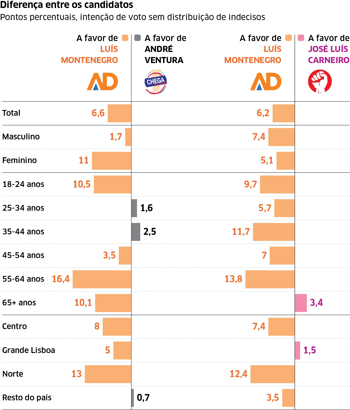 Se no mês passado a AD ganhava em todos os segmentos, exceto junto dos mais velhos, agora perde a liderança do voto mais jovem para o Chega, enquanto os eleitores acima de 65 anos dão ainda vantagem ao PS. Os socialistas ganham na Grande Lisboa, a AD segura o voto no Norte e Centro, mas é ultrapassada pelo Chega no resto do país.