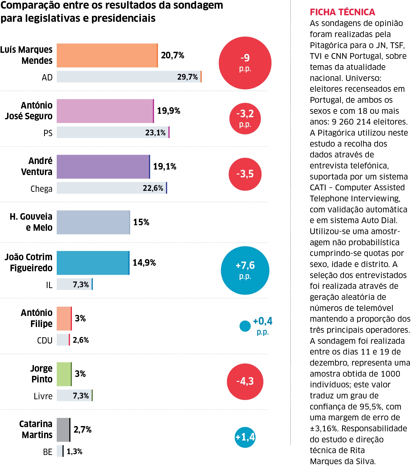 Sondagem realizada pela Pitagórica para a TSF-JN- TVI-CNN Portugal, com o objetivo de avaliar a opinião dos portugueses sobre a intenção de voto em legislativas. O trabalho de campo decorreu entre os dias 11 e 19 dezembro. A amostra foi recolhida de forma aleatória junto de eleitores recenseados em Portugal e foi devidamente estratificada por género, idade e região. A taxa de resposta foi de 49,7%. As mil entrevistas telefónicas recolhidas correspondem a uma margem de erro máxima de +/- 3,16% para um nível de confiança de 95,5%. A direção técnica do estudo é da responsabilidade de Rita Marques da Silva.