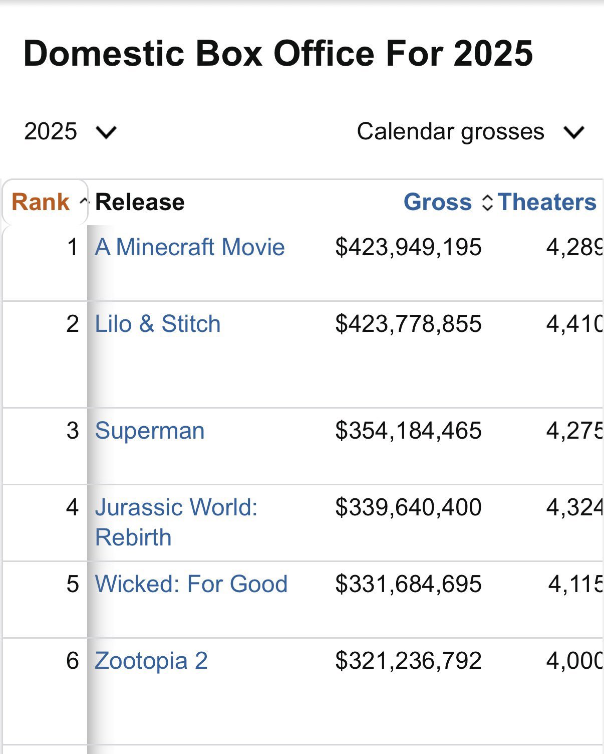 Os líderes foram Um Filme Minecraft, com US$ 423,9 milhões, e Lilo & Stitch, com US$ 423,7 milhões.