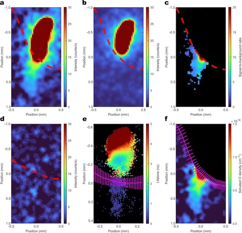 Os cientistas medem estes átomos de oxigénio individuais forçando-os a absorver dois fotões em simultâneo, o que os coloca num estado excitado. Ao regressarem ao seu estado fundamental, libertam o excesso de energia sob a forma de fluorescência. Medindo essa energia excedente – ou luz –, é possível determinar as concentrações de formas específicas de um elemento.
