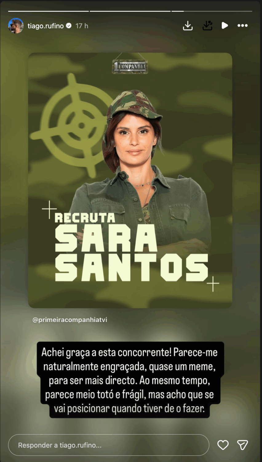 Sara Santos é uma das “recrutas” da 1ª Companhia, o reality show que estreou na noite desta quinta-feira, 1 de janeiro, na TVI, e que pretende desafiar várias celebridades numa base militar, onde terão de viver segundo as regras de um comandante e dos seus instrutores.