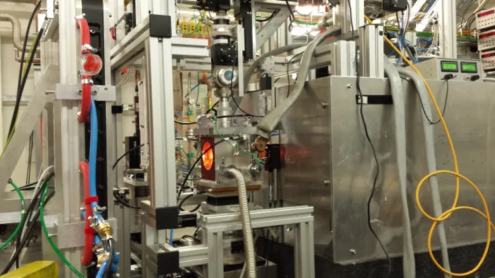 A configuração experimental, que inclui uma câmara de vácuo que aloja uma célula de diamante de alta temperatura. A cor laranja da célula provém da luz que emite a altas temperaturas. (Carmen Sánchez-Valle)