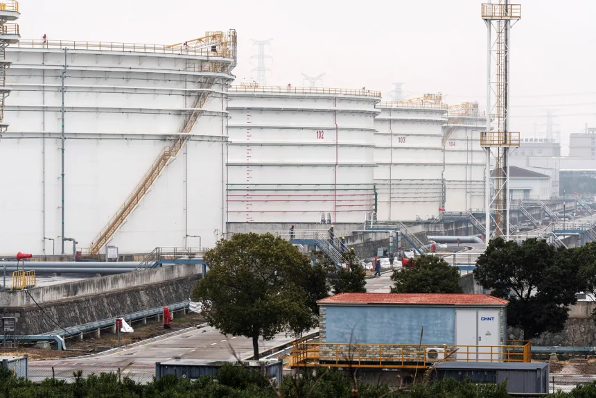 Depósitos de armazenamento de petróleo numa instalação da China Petroleum & Chemical Corp. (Sinopec), perto de Ningbo, na China, na segunda-feira. Qilai Shen/Bloomberg/Getty Images