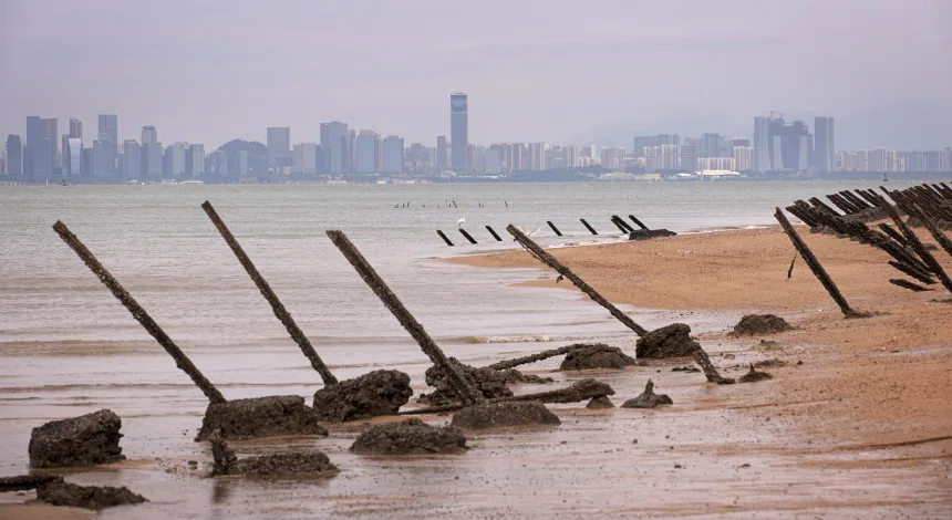 Obstáculos antitanque em tempo de guerra numa praia em Kinmen, Taiwan, com a cidade chinesa de Xiamen em segundo plano, a 7 de outubro de 2023. Alex Wong/Getty Images
