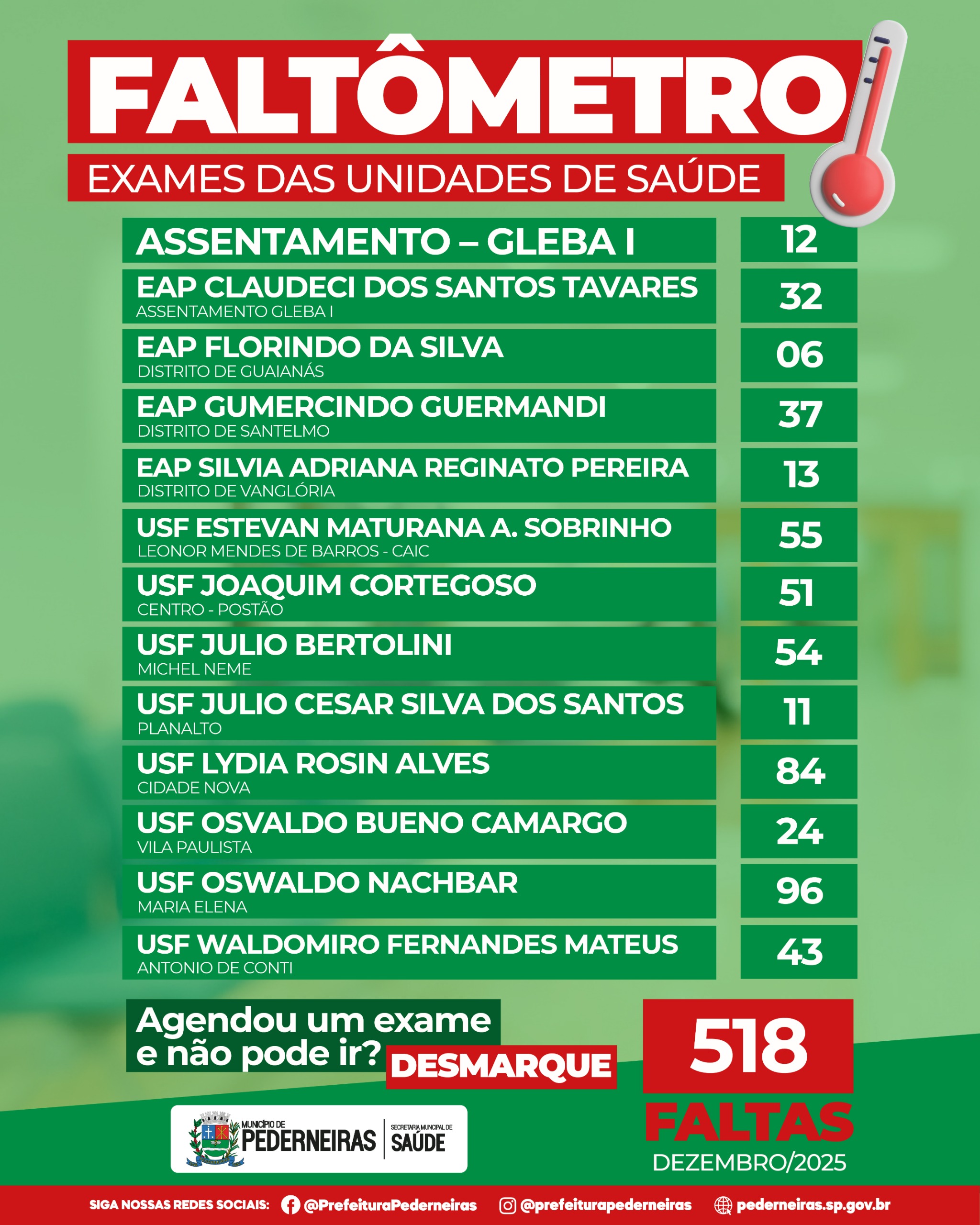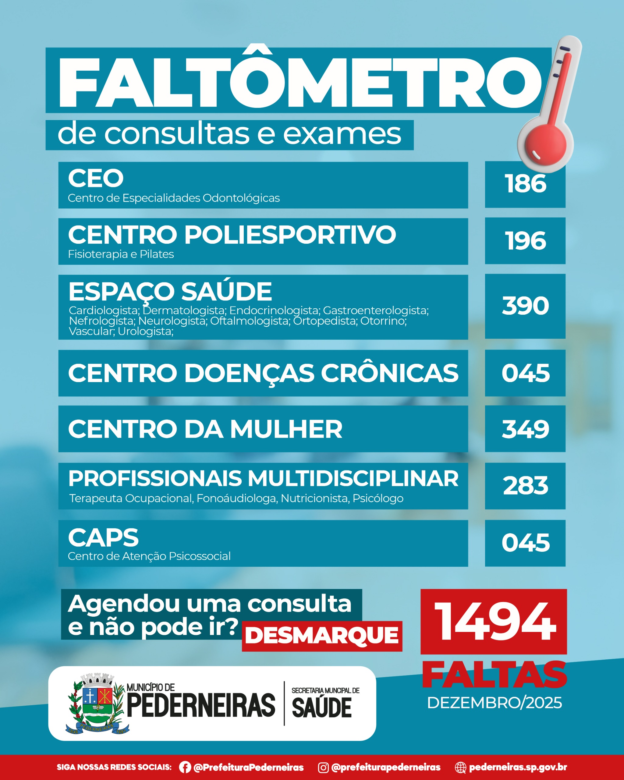 A Prefeitura de Pederneiras, por meio da Secretaria Municipal de Saúde, divulga o Faltômetro da Saúde referente ao mês de dezembro de 2025, que registra faltas em consultas, atendimentos especializados e exames na rede municipal de saúde.