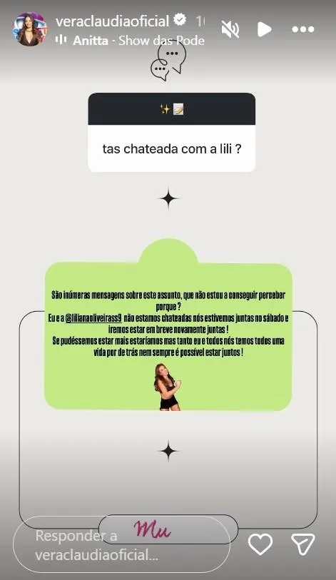 “Eu e a Liliana não estamos chateadas, nós estivemos juntas no sábado e iremos estar em breve novamente”, garantiu Vera Cláudia.