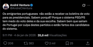 “Os emigrantes portugueses não estão a receber os boletins de voto para as presidenciais. Sabem porquê? Porque o sistema PSD/PS tem medo do voto deles e da sua escolha. Sabem bem que saíram de Portugal por culpa destes partidos e estão fartos dos candidatos do sistema”, escreveu o candidato presidencial apoiado pelo Chega a 4 de janeiro, no X.