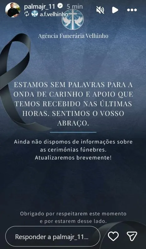 “Obrigado por respeitarem este momento e por estarem desse lado”, findou a Agência Funerária Velhinho.