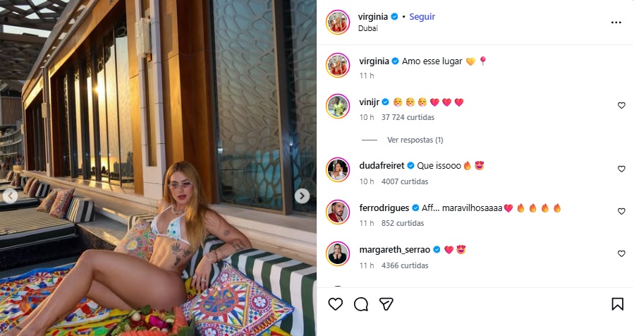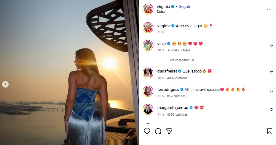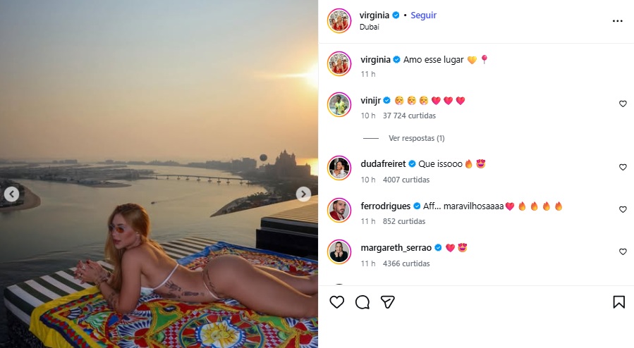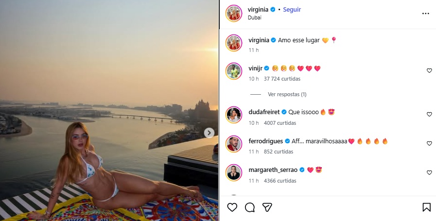 Presente em Dubai, Virginia também se declarou à paisagem digna de cinema que se encontra visitando. Compartilhando uma série de cliques, a rainha de bateria da Grande Rio levou Vini Jr. ao delírio, algo sinalizado através do comentário do jogador na publicação.