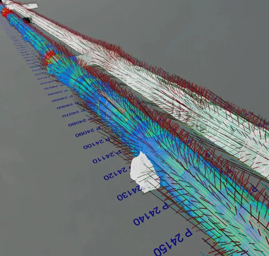 Os dados de “Measurement While Drilling” são utilizados para analisar e visualizar as condições geológicas ao longo do túnel. (Skanska)