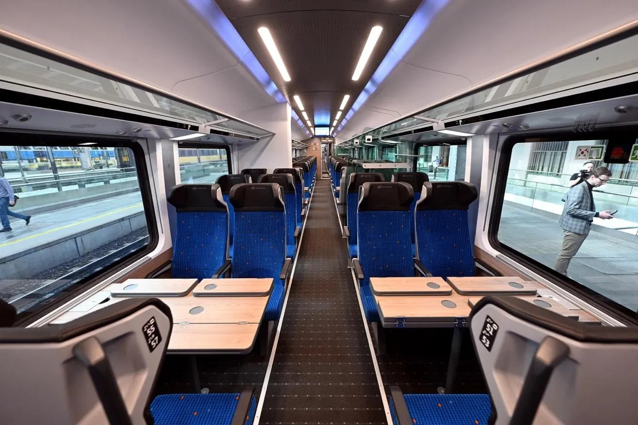 Os comboios checos, em azul e branco, podem atingir velocidades até 230 km/h na Alemanha e incluem carruagem-bar/restaurante, carruagens totalmente acessíveis, Wi-Fi a bordo e uma área de recreio para crianças.