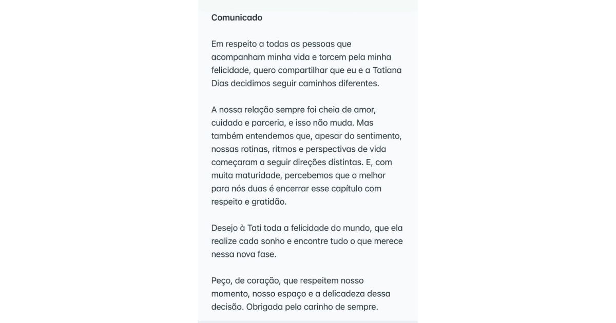 Ainda segundo a artista, o término ocorre com gratidão pela história construída ao longo do relacionamento. Em outro trecho da declaração, Lauana desejou felicidade à ex-noiva: “Desejo à Tati toda a felicidade do mundo, que ela realize cada sonho e encontre tudo o que merece nessa nova fase”.
