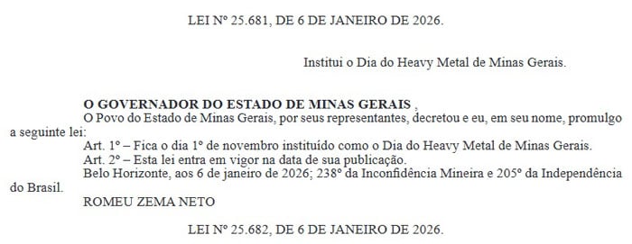 O estado de Minas Gerais, historicamente reconhecido como um dos berços do metal na América Latina, oficializou sua ligação com o gênero. O governador Romeu Zema sancionou a lei que insere oficialmente no calendário estadual o “Dia do Heavy Metal de Minas Gerais”, a ser celebrado anualmente em 1º de novembro.