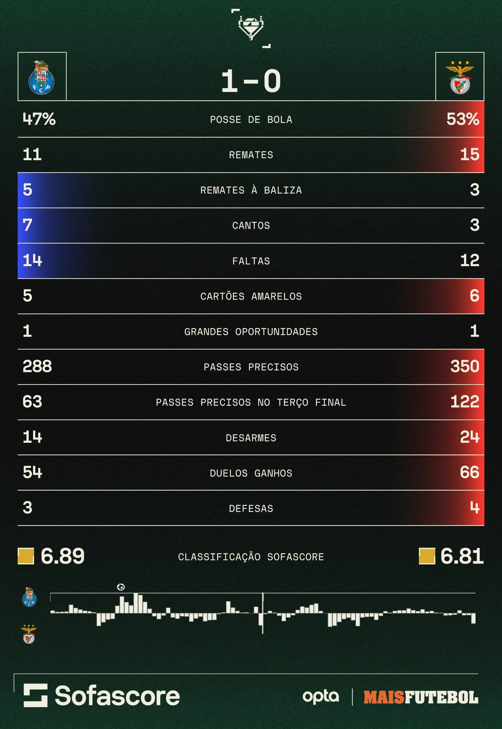 Se seria de esperar que o FC Porto tivesse melhores números a nível defensivo, desengane-se. As estatísticas do Sofascore dizem que os encarnados tiveram mais desarmes (24 contra 14) e mais duelos ganhos (66 para 54), talvez pelas recuperações rápidas de bola do Benfica, que inviabilizavam os contra-ataques contrários.