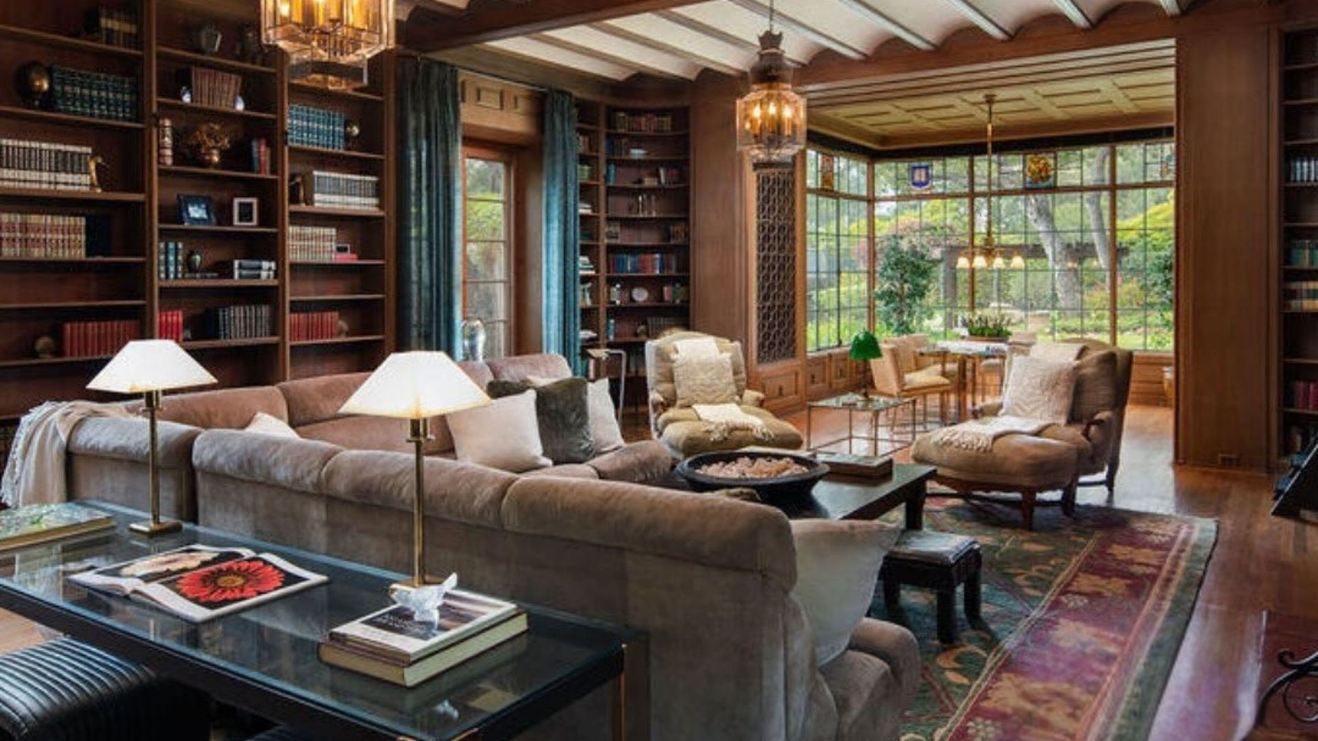 Entre os destaques do interior está uma biblioteca imponente, revestida com painéis de madeira e teto abobadado, ideal para a leitura de roteiros. A área social conta ainda com uma sala de jantar formal decorada com vitrais coloridos, reforçando o caráter artístico da residência.