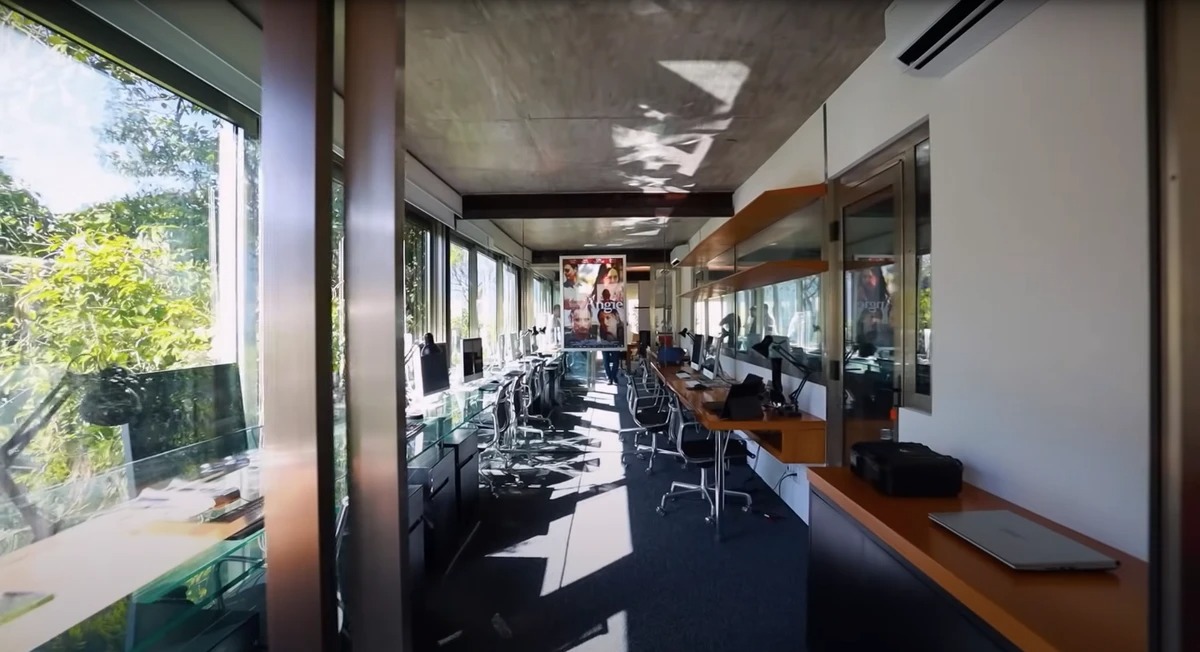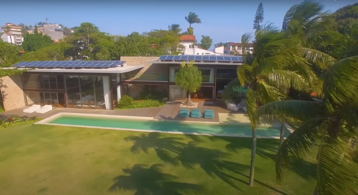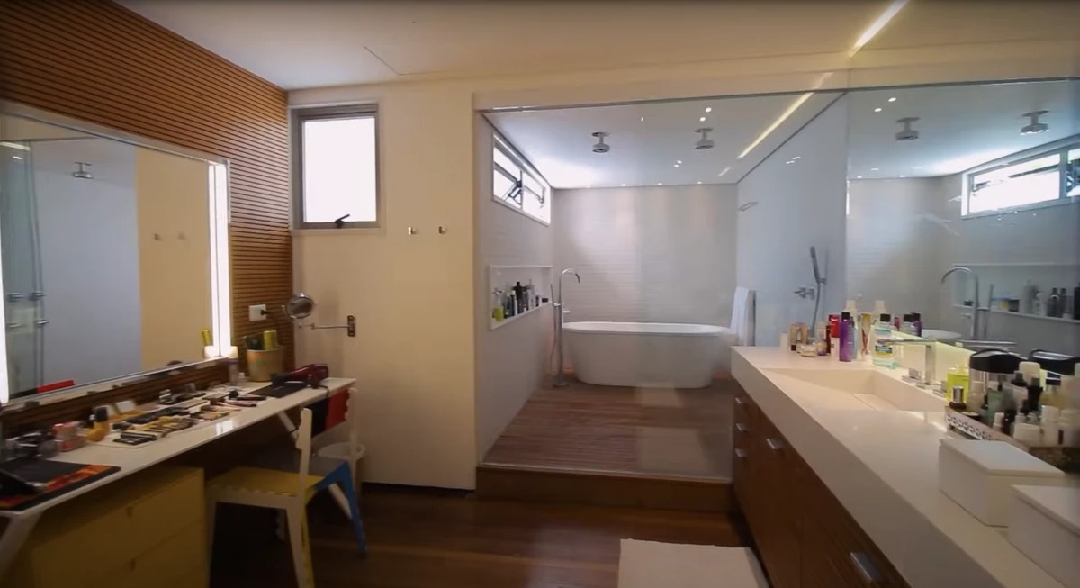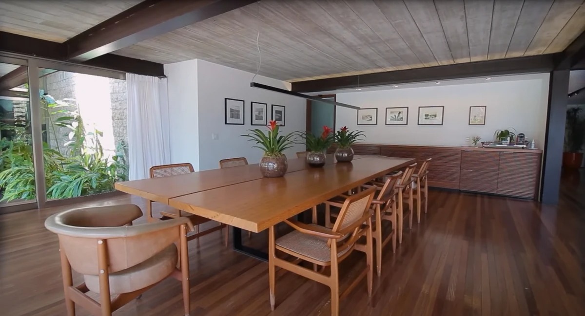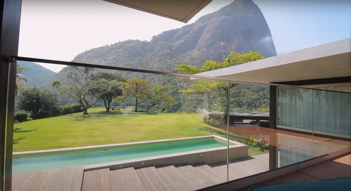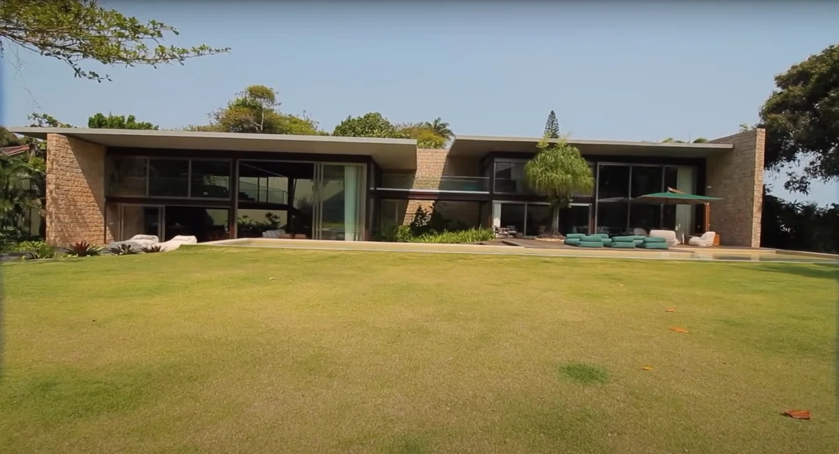 Com 6.000 m² de terreno e 2.000 m² climatizados, o imóvel possui sete suítes, 18 banheiros e três cozinhas completamente equipadas. As áreas de lazer contam com cinema particular, boate, academia completa, quadra de tênis, campo de futebol e horta.