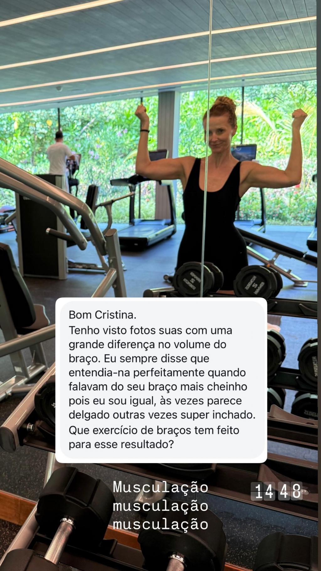 “Bom dia, Cristina. Tenho visto fotos suas com uma grande diferença no volume dos braços. Eu sempre disse que entendia-a perfeitamente quando falavam do seu braço mais cheiinho, pois sou igual. Às vezes, parece delgado, outras vezes, muito inchado. Que exercícios de braços tem feito para esse resultado?”, quis saber essa seguidora.