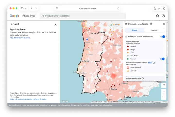Para aceder a este mapa, tem de ir ao site sites.research.google/floods. Isso irá abrir um mapa do mundo, com uma coluna à direita onde pode ativar ou desativar as visualizações.