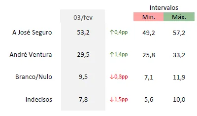 A segunda volta das eleições presidenciais tem lugar no próximo domingo, mas se fosse hoje, António José Seguro receberia 53,2% dos votos, ficando à frente de André Ventura, que teria 29,5% dos votos. Estes resultados são no entanto sem distribuição de indecisos, que montam neste momento a 9,5% dos eleitores. Acrescem ainda 7,8% de eleitores que declaram a intenção de votar branco ou nulo.