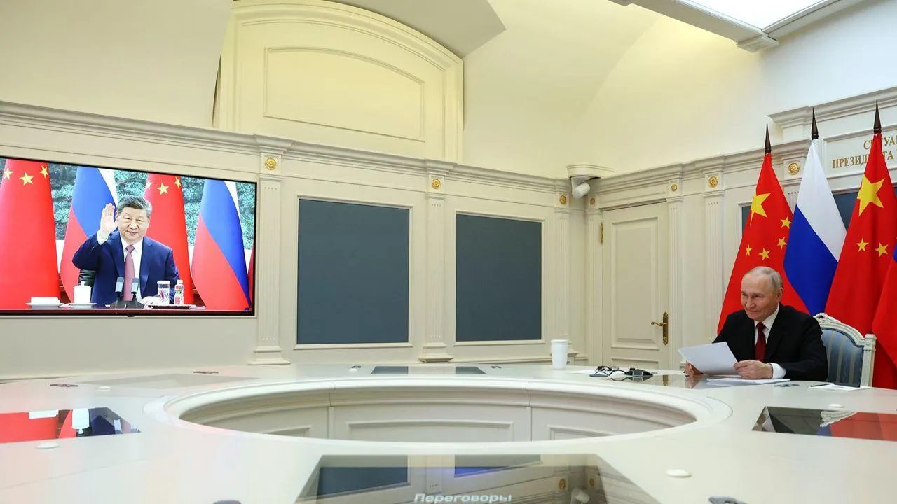 O presidente russo, Vladimir Putin, conversa com o presidente chinês, Xi Jinping, por videoconferência no Kremlin, em Moscovo, na quarta-feira, 4 de fevereiro de 2026. (Vyacheslav Prokofyev/Sputnik, Kremlin Pool Photo via AP)