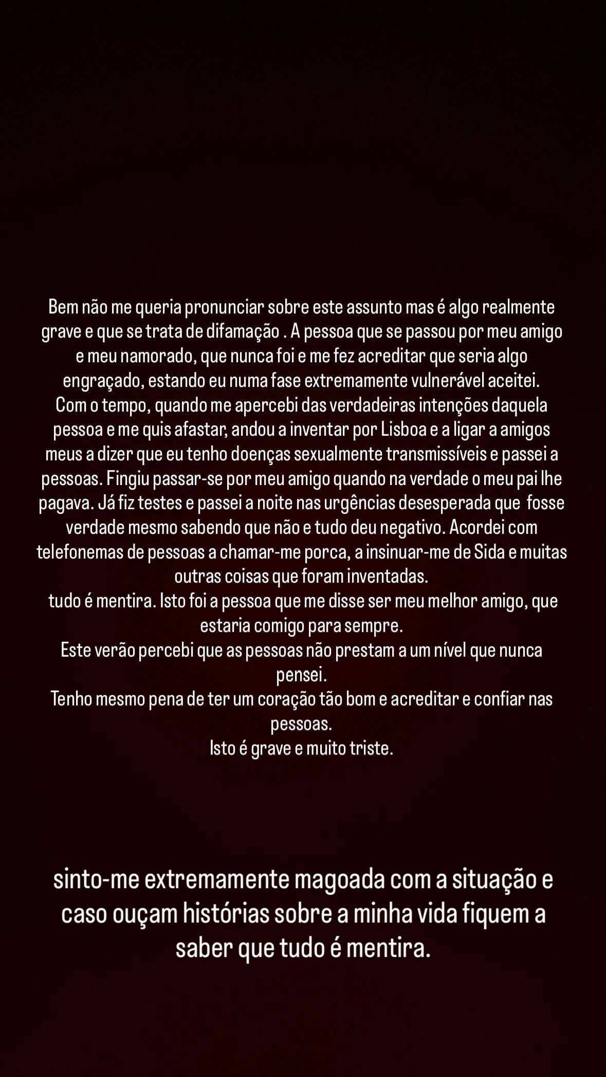 No ‘Manhã CM’ o tema foi debatido, e o Leo Caeiro trouxe para cima da mesa o que ela escreveu em comunicado, “não me queria pronunciar sobre este assunto, mas é algo realmente importante e grave e que se trata de difamação. A pessoa que se passou por meu amigo e meu namorado, neste caso o Wilson, que nunca me foi e fez-me acreditar que seria alguém engraçado estando eu numa fase extremamente vulnerável. Se bem se recordam, ela naquela altura diz que tinha fugido lá daqueles amigos que lhe roubaram o dinheiro e fizeram-lhe mal”, inclusive faz aqui uma afirmação muito grave. “Fingiu-se passar por um amigo quando, na verdade, o meu pai pagava-lhe.”