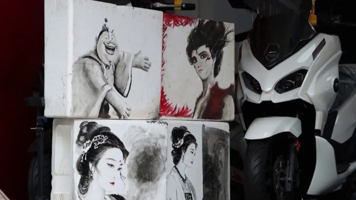 “Como somos uma oficina, não temos pincéis nem papel para pintar. No entanto, o óleo de motor é uma tinta comum. Às vezes, ao montar uma mota nova, acidentalmente toco no óleo com as minhas luvas e deixa uma marca. E isso fez-me perceber que poderia usar a caixa de esferovite como papel e o óleo de motor como tinta.”