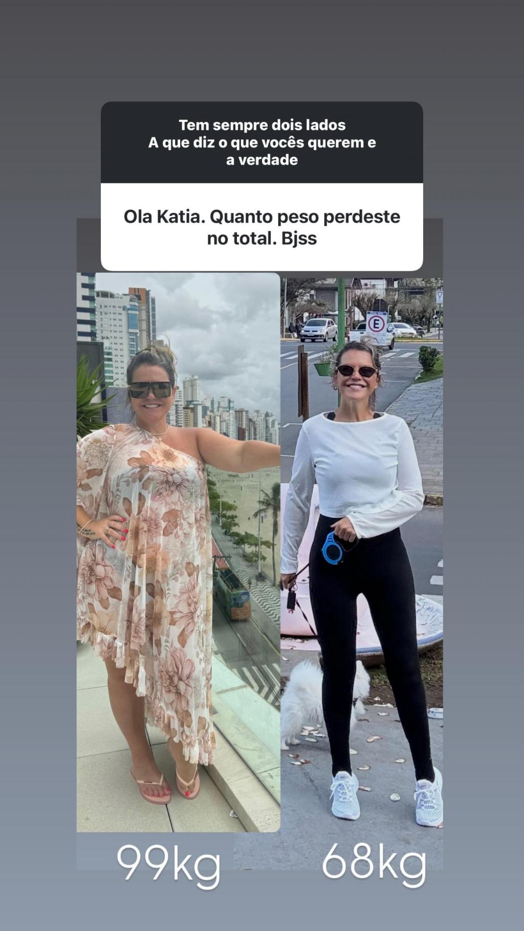 “Olá, Katia. Quanto peso perdeste no total?”, quis saber, por exemplo, um internauta. E a irmã mais nova de Cristiano Ronaldo mostrou um “antes” e “depois”: na fotografia antiga, Katia Aveiro surge com mais 30 quilos, ou seja, 99 quilos; na atual, a empresária desfila elegância com menos peso, isto é, 68 quilos.