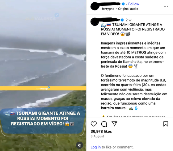 Nas redes sociais, nomeadamente no Facebook e Instagram, estão a circular vídeos que aparentemente mostram um tsunami de 10 metros a atingir a costa da Rússia depois de um sismo de 8.8 na escala de Richter registado ao largo daquele país na madrugada de 30 de julho. “Imagens impressionantes e inéditas mostram o exato momento em que um tsunami de até 10 METROS atinge com força devastadora a costa sudeste da península de Kamchatka, no extremo-leste da Rússia!”, pode ler-se numa das publicações.