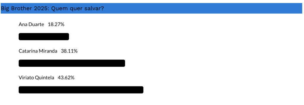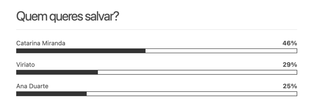 Na sondagem que decorre no nosso blogViriato Quintela é o mais votado para salvar com 43,62% dos votos, seguido de Catarina Miranda com 38,11% dos votos. Ana Duarte é a concorrente menos votada para salvar com 18,27% dos votos.